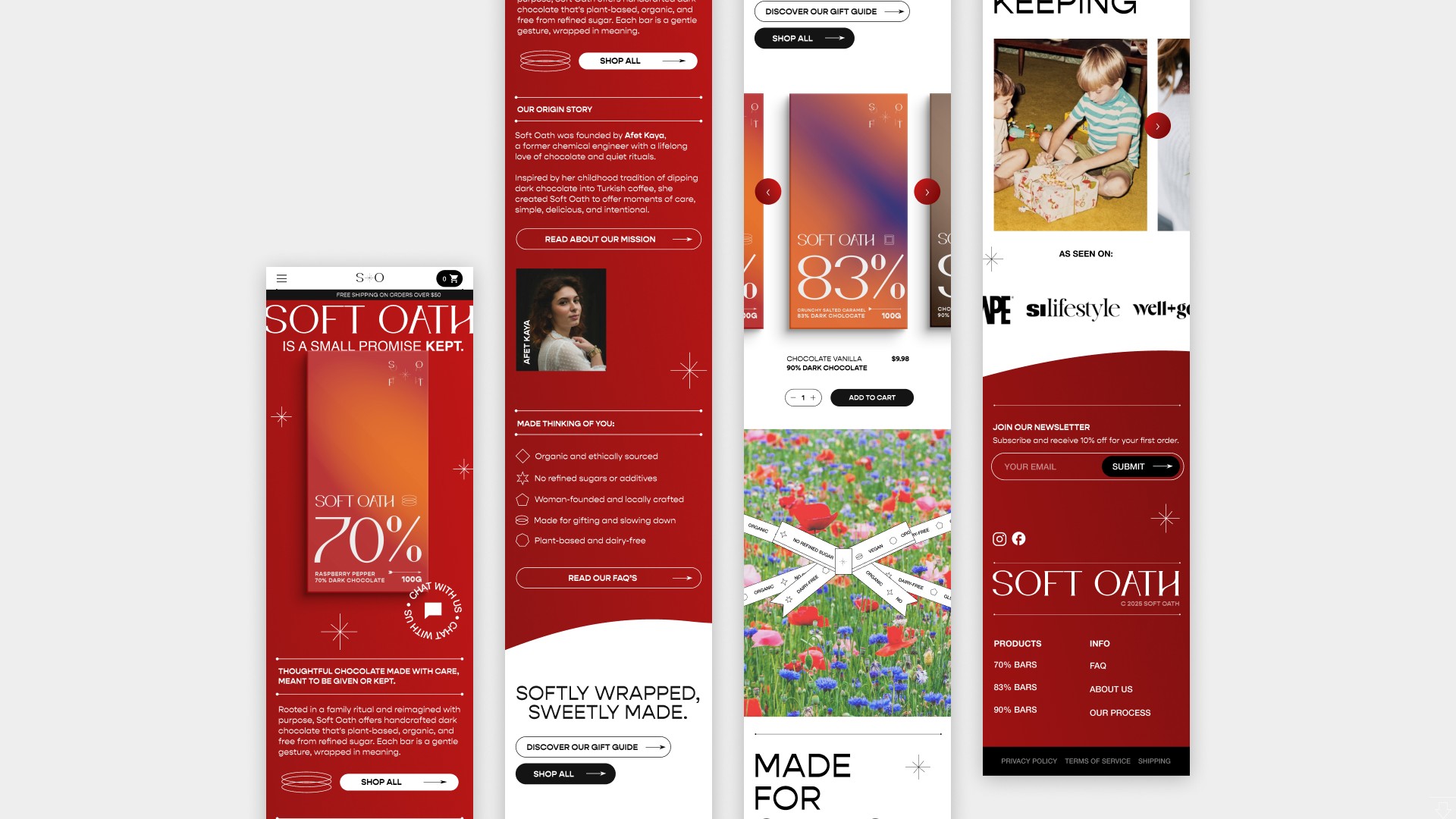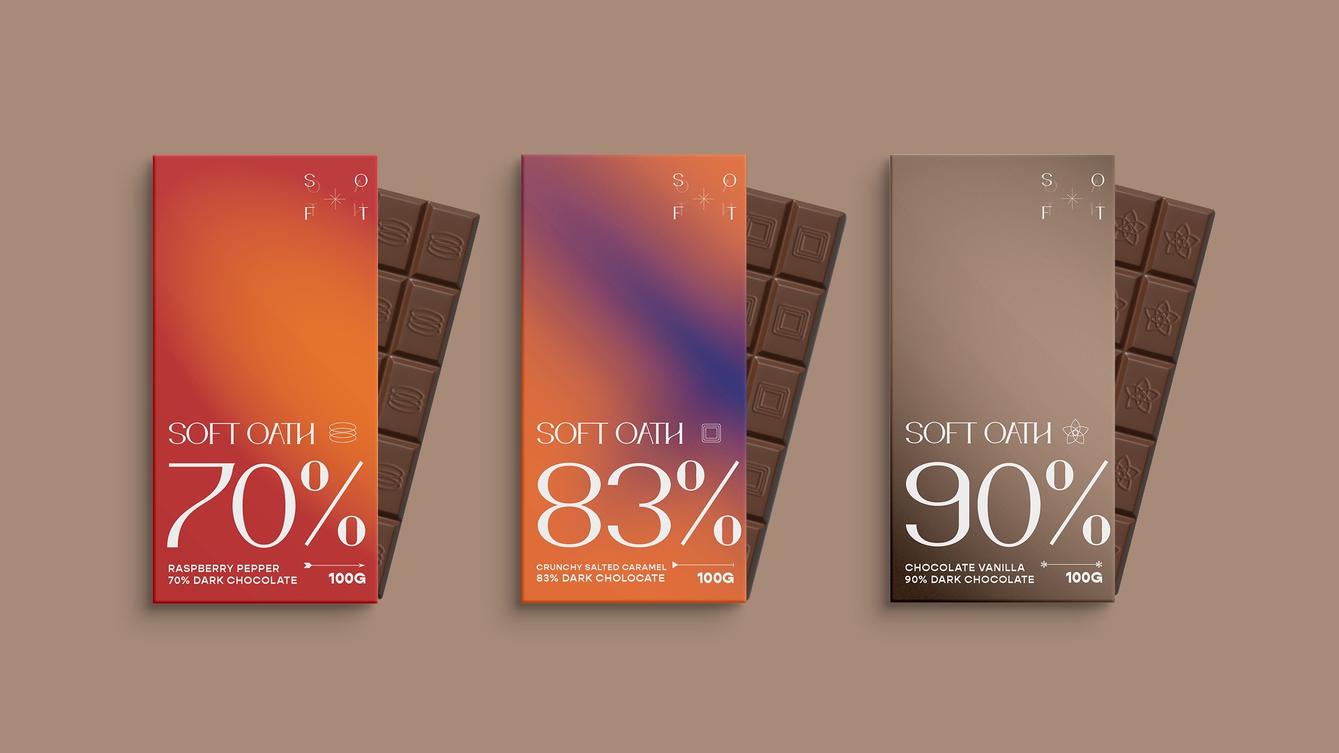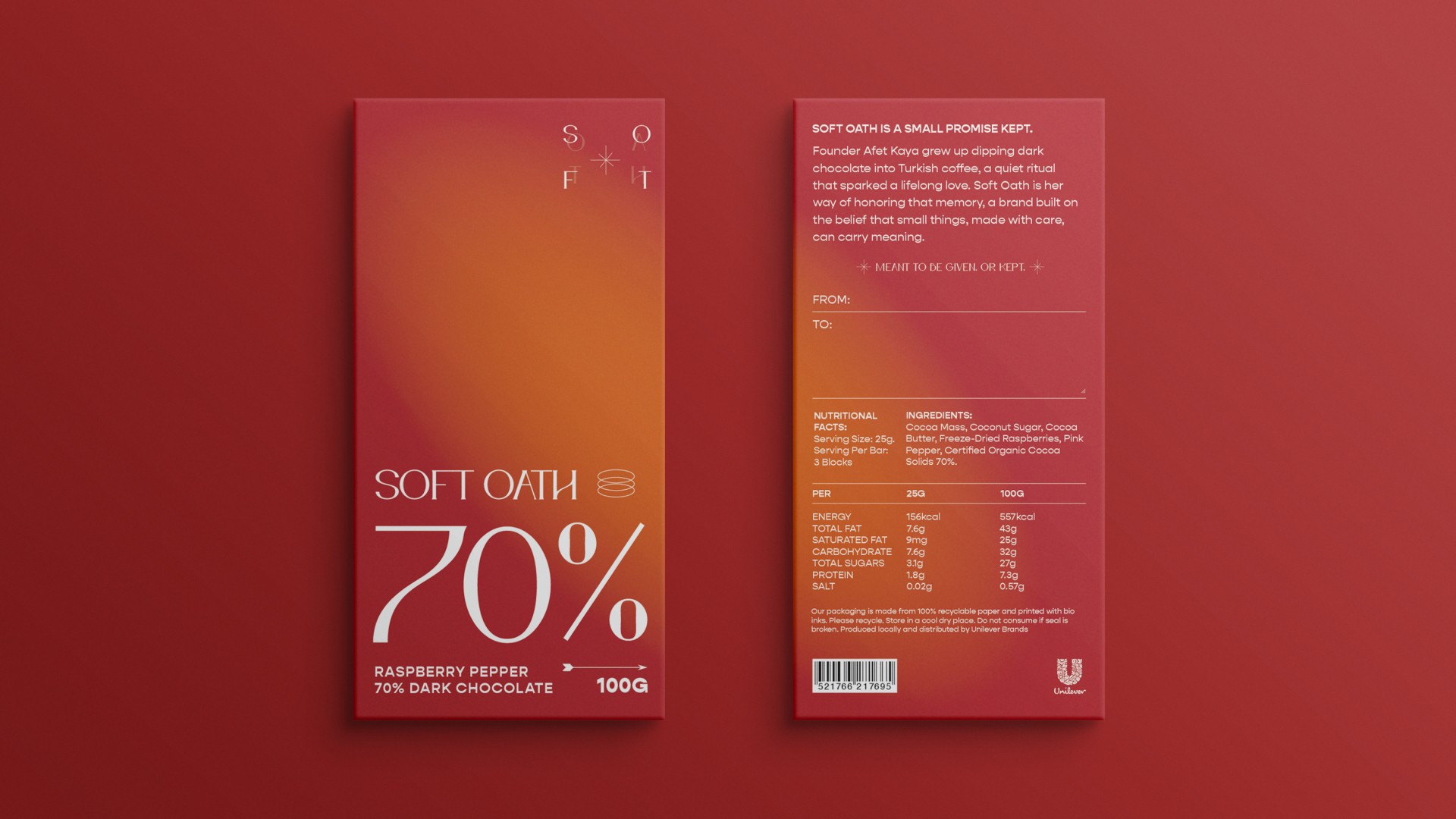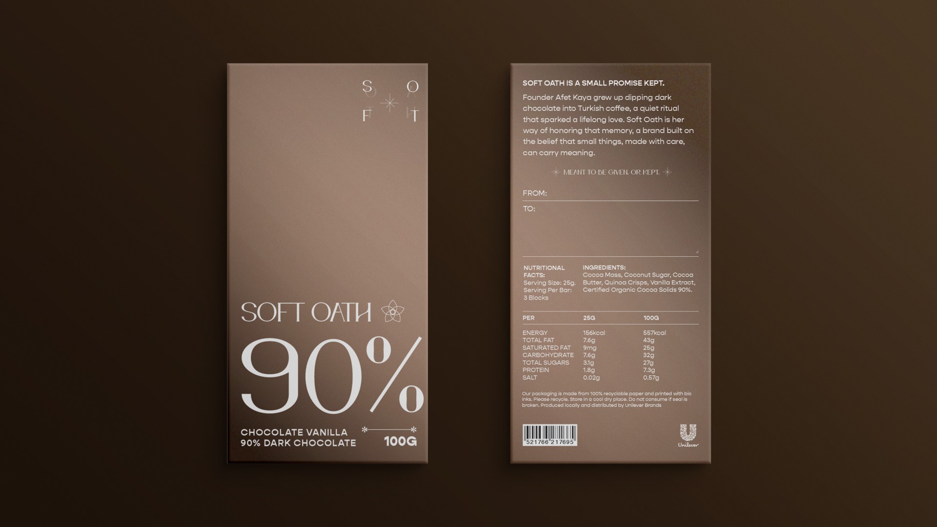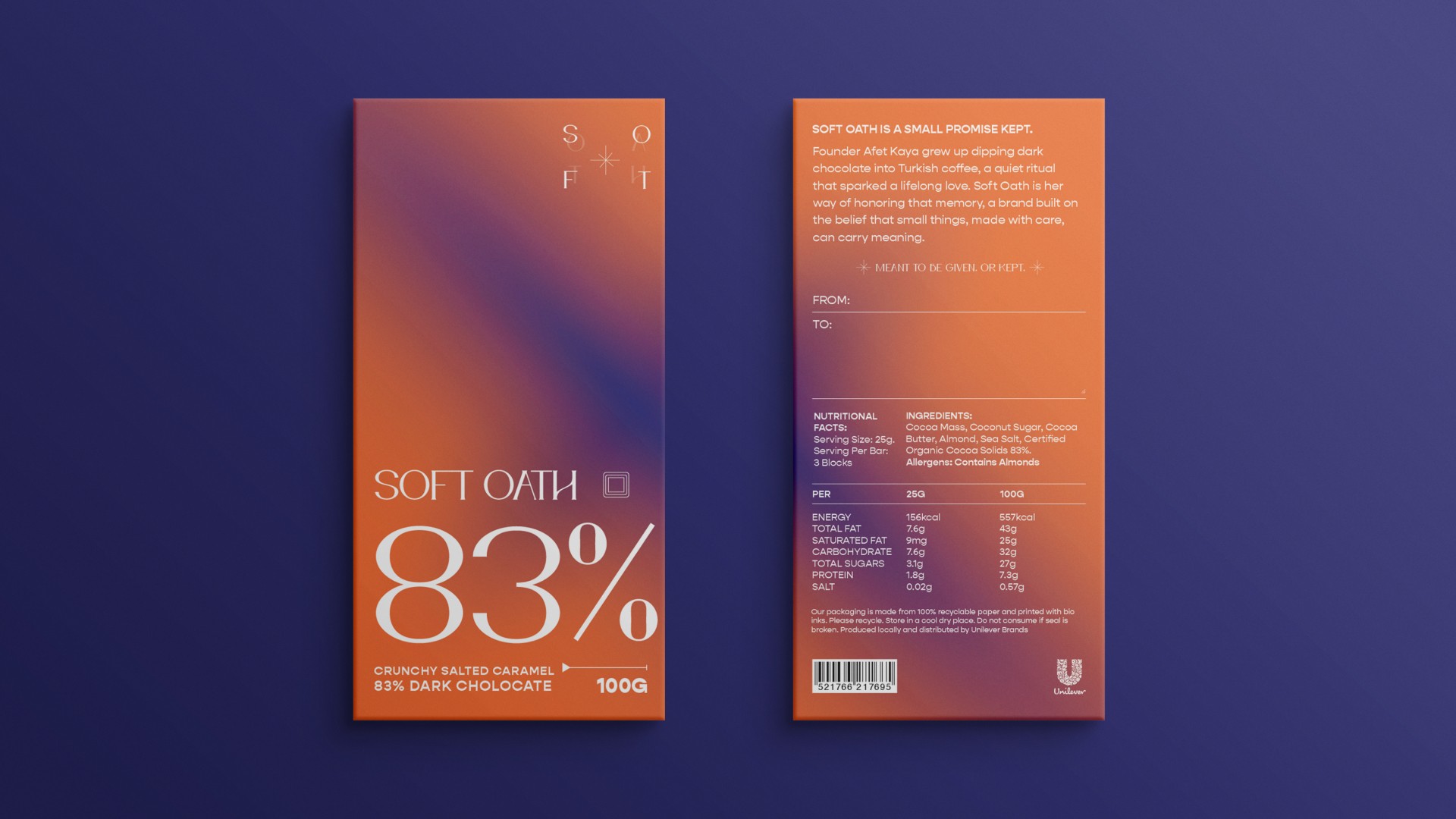 Unilever’s MADE LOCAL range, created in partnership with local producers, introduces Soft Oath, a sustainable, all-natural, dairy-free chocolate brand. With its soft typography and warm color gradients, the identity reflects both the purity of the product and its deep connection to local sourcing, communicating a message of quality, sustainability, and the warmth of handcrafted goods made within the community.