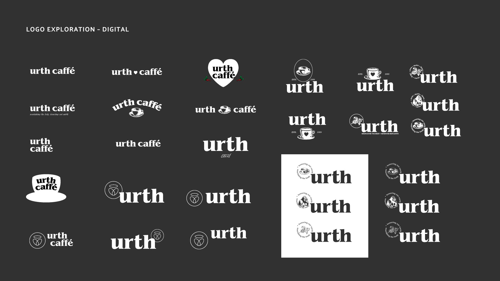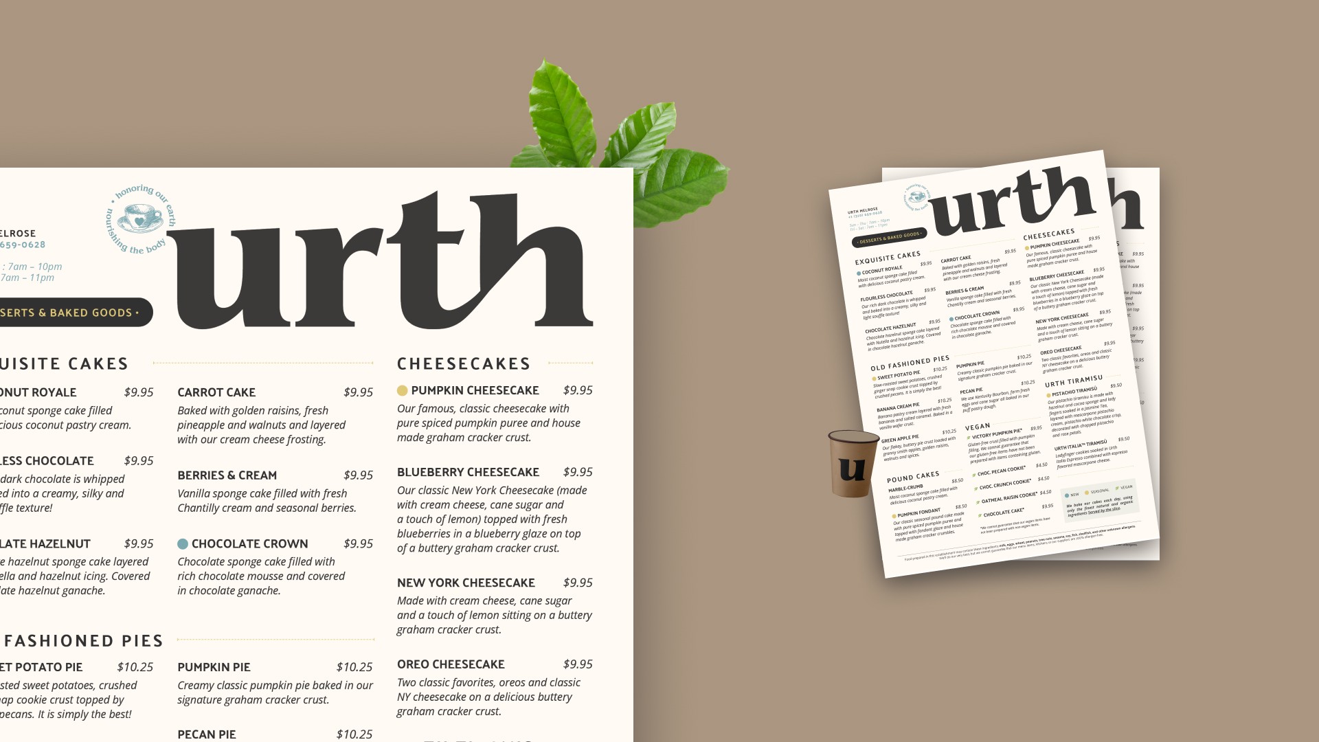 This project reimagines the visual identity of Urth Caffé, a café that emphasizes health-conscious cuisine, sustainability, and strong connections with family farms. By simplifying the brand to just “Urth,” the goal was to create a more memorable and impactful presence. A cohesive, minimal visual system was developed to balance the café’s rich, maximalist architecture and intricate menu, allowing its food, atmosphere, and commitment to organic, sustainable practices to shine through. This refined identity aligns the café’s visual presence with its core values and mission.